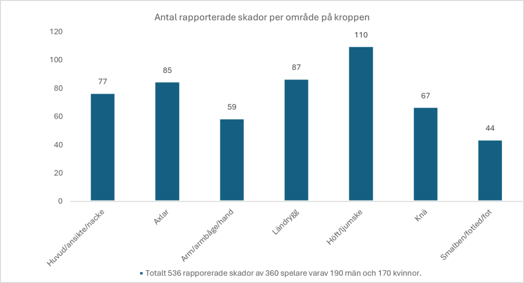 Hösten 2022 fyllde 360 spelare (190 män och 170 kvinnor) i ett frågeformulär om skador under föregående säsong från SHL, HA och SDHL. Totalt rapporterades 536 skador. Skador i höft/ljumske, ländrygg och axlar var de tre vanligaste skadelokalisationerna. Nästan var tredje spelare rapporterade besvär med höft/ljumske. Det var ingen signifikant skillnad mellan könen i skadeförekomsten, men höft-/ljumskbesvären var allvarligare bland kvinnliga spelare.