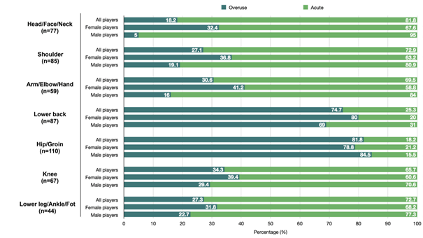 Akuta skador var vanligast för alla skadelokalisationer förutom höft/ljumske och ländrygg. 74% av ländryggsbesvären och hela 82% av höft-/ljumskskadorna kategoriserades som överbelastningsskador. Majoriteten av dessa skador ledde inte till någon frånvaro. Frånvaro är därför ett trubbigt mått när det kommer till att utvärdera skador.